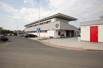 Novostavba zázemí fotbalového klubu FC Dobřany s hledištěm, včetně nových travnatých hřišť s oplocením, zavlažováním, přidružených objektů (stánek, sklad, věž) a přístupových komunikací a parkovišť.
